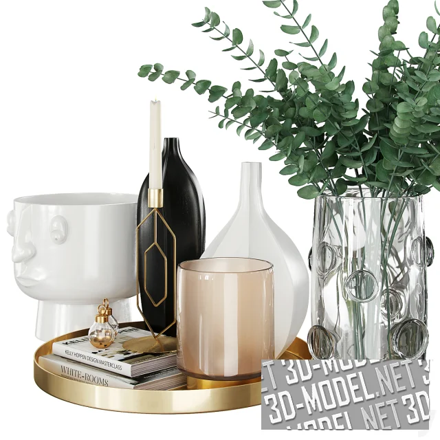 Современный декоративный набор, состоящий из нескольких предметов интерьера, которые можно приобрести в La Redoute. В комплекте круглый поднос SOLADOR из позолоченного металла, подсвечники Hokuto и Oror высотой 18 см, книги, включая "Kelly Hoppen Design Masterclass" и "White Rooms". В декоре также принимают участие ветви эвкалипта в вазе.