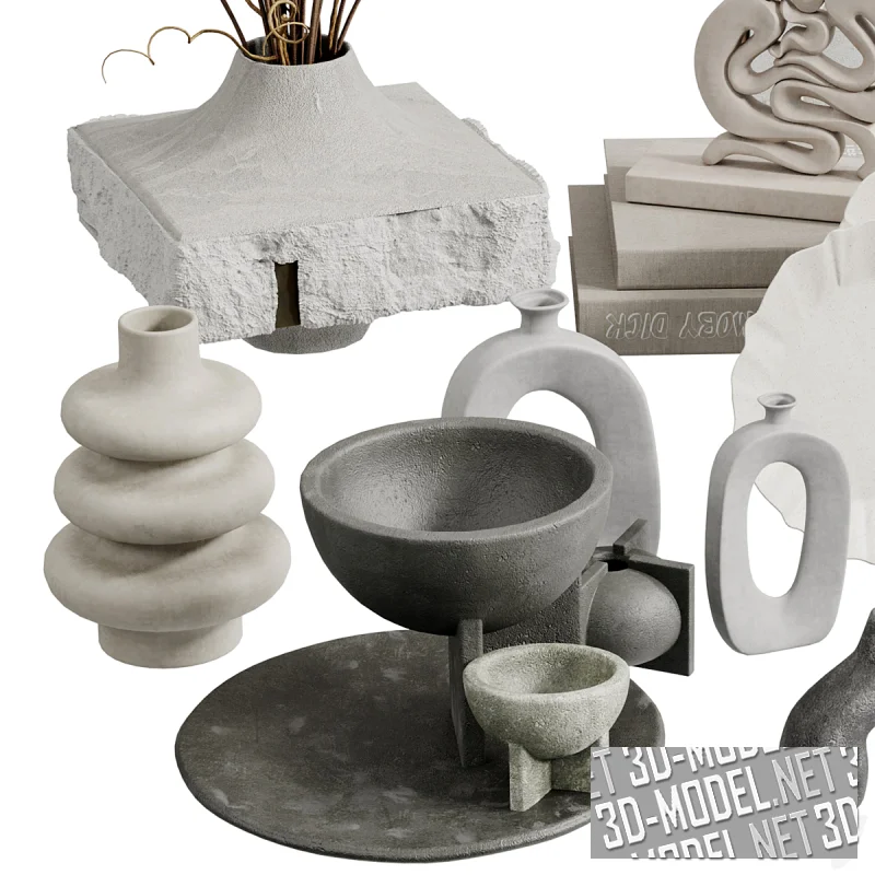 Интерьерная композиция, собранная из декоративных объектов в светлой, нейтральной палитре. Основу составляют предметы из керамики и камня с матовой поверхностью, выполненные в оттенках молочного, бежевого и мягкого серого. Формы варьируются от плавных и округлых до более скульптурных и архитектурных, создавая интересный визуальный ритм и ощущение продуманного баланса.