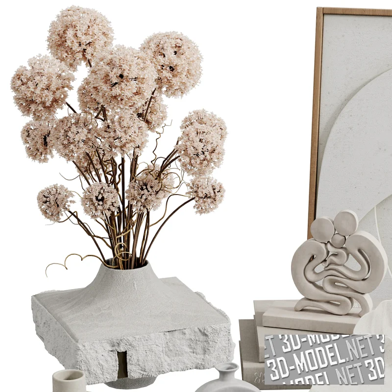 Центральным акцентом выступает ваза с сухоцветами, установленная на массивном основании с грубой, слегка неровной фактурой. Легкие соцветия на тонких стеблях добавляют композиции вертикаль и воздушность, смягчая тяжесть каменных форм. Рядом расположены декоративные чаши, вазы и абстрактные объекты, каждый из которых имеет собственный характер, но при этом органично вписывается в общее стилистическое решение.