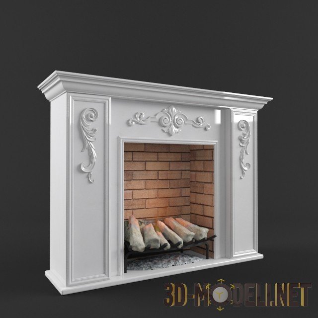 Классический каминный портал из белого мрамора. На боковых пилястрах и над каминной топкой размещены декоративные элементы в виде барочных завитков. Внутри топочная камера отделана жёлто–красным огнеупорным кирпичом. На дне топки – металлическая решётка с разложенными на ней дровами.