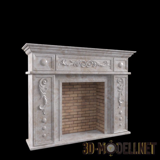 Мраморный каминный портал в стиле барокко. Изготовлен из натурального мрамора бежевого цвета. На боковых панелях и в верхней части размещены барельефные декоративные элементы в виде кругов и растительных завитков. Топочная камера изготовлена из желтого огнеупорного кирпича.