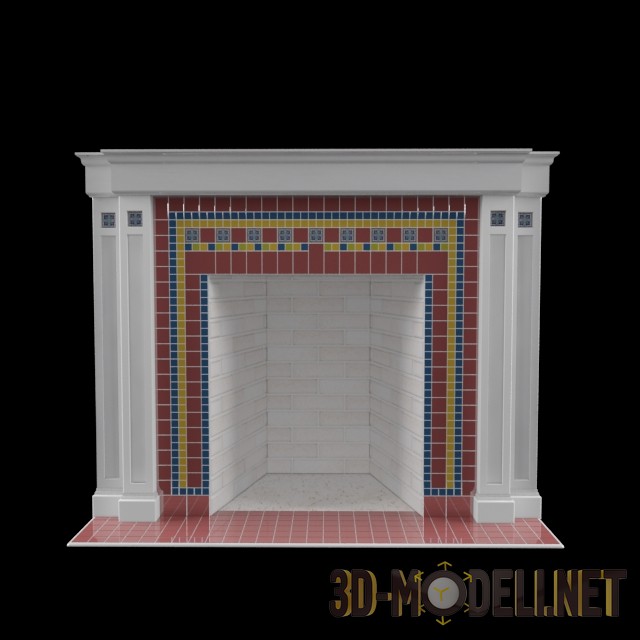 Каминный портал в этно–стиле. Обрамление топки камина выполнено из небольших плиток разного размера, трёх цветов: розовый антик, серовато–жёлтого и небесно–синего. Также присутствуют квадратные плиточки с орнаментом. Швы затёрты белой фугой. Плитки выложены в виде орнамента в античном стиле. Основной корпус с пилястрами по бокам и полка сделаны из белого мрамора.