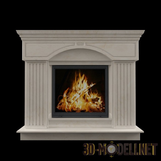 Классический портал камина из светлого, бежевого мрамора. По центру расположилась квадратная топка из чёрного чугуна с огнеупорной стеклянной створкой. Декор портала выполнен в стиле классицизм. По бокам от топки размещены широкие пилястры с вертикальными канавками каннелюр. Над топкой вырезан венец с симметричной лаконичной резьбой. Он формирует арку над топкой.