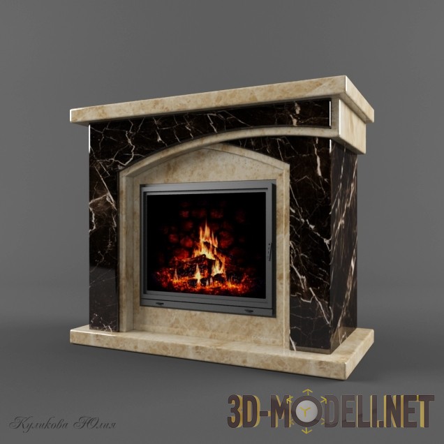 Классический мраморный портал в стиле модерн, сделан с прямоугольной чугунной топкой. Портал изготовлен из двух видов мрамора: чёрного с белыми прожилками и бежевого. Декоративная верхняя часть придает камину динамику.