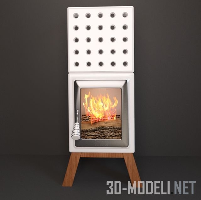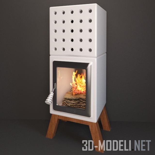 Оригинальный камин Barbaros с белым керамическим корпусом топки на деревянных ножках. Верхняя часть корпуса оборудована множеством круглых отверстий для конвекции теплого воздуха.