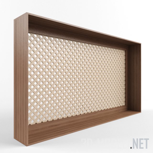 Прямоугольный экран для батареи отопления, представляющий собой решетку светло-бежевого цвета в коричневой рамке. Классическое решение для интерьера.