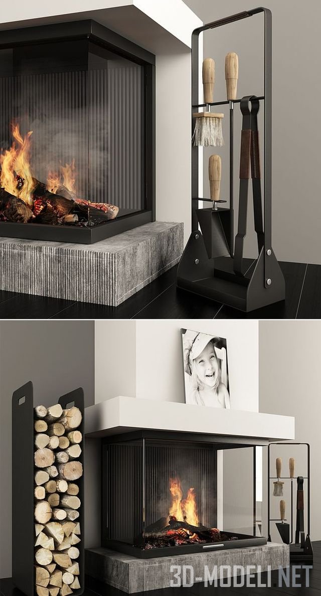 Современный камин белого цвета, с горящим огнем и детским портретом на верхней полке. Справа от камина рамка с каминными принадлежностями: щипцами, лопаточкой, а слева - стойка с аккуратно уложенными дровами.