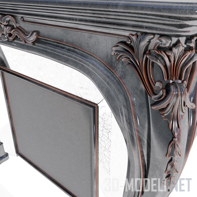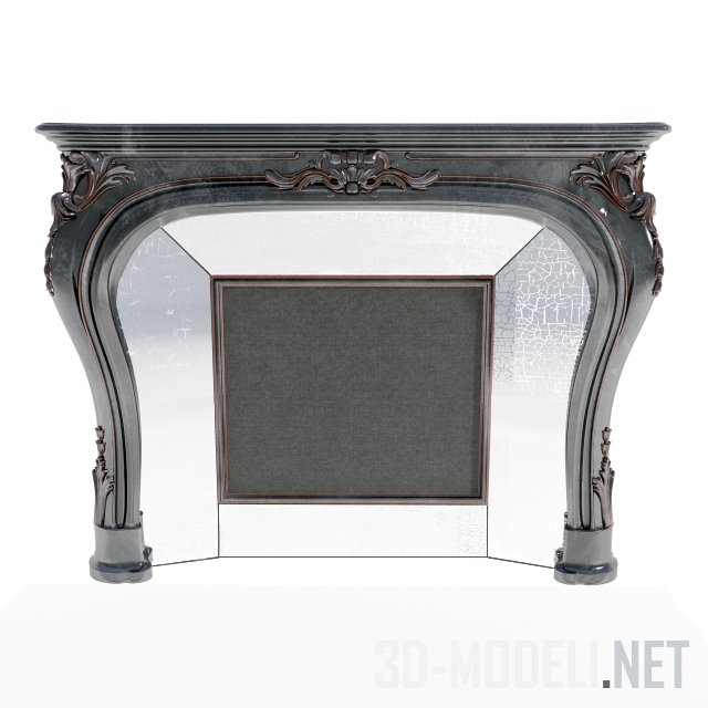 Каминный портал в стиле барокко от Roberto Giovannini. Наружное обрамление выполнено из черно-серого полированного камня с резными барочными элементами и легкой красно-коричневой патиной на краях резьбы. Внутренняя часть портала отделана белыми металлическими панелями с «зеркальной» трещинкой кракелюр. Габарит портала: 151 х 40 х 122 см.