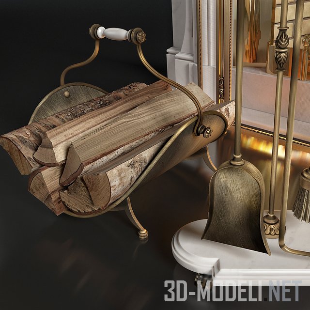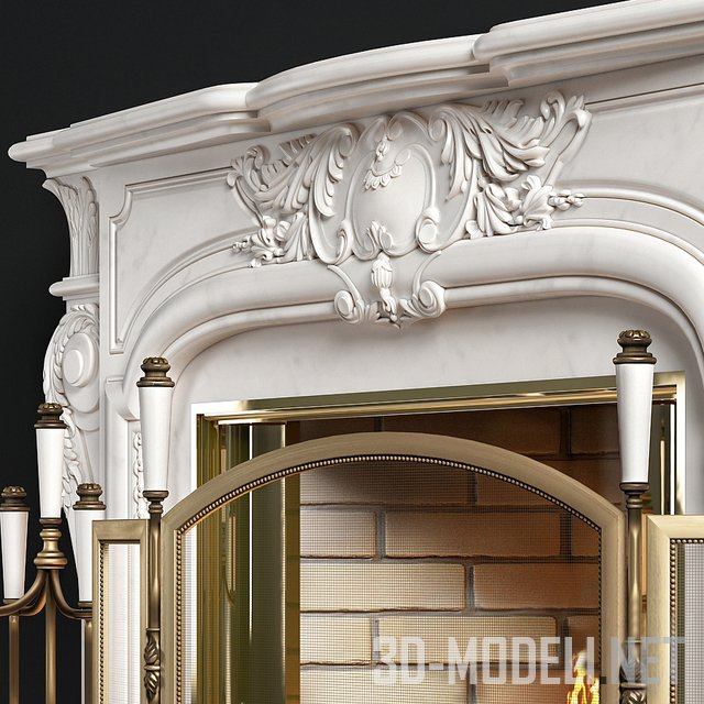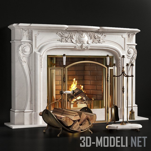 Декоративный каминный портал из белого мрамора Louis XIV с металлической дровницей и подставкой с инструментом для обслуживания камина. Фигурное основание стойки , ручки на кочерге, метелке, лопатке, на самой подставке и дровнице - белые. Металлические части аксессуаров - латунные, с темной патиной. Обрамление топки и рамка каминного экрана из каленого стекла - золотистые. Внутреннее пространство топки с горящими дровами отделано огнеупорным кирпичом. Портал камина украшен барельефными орнаментами в стиле ампир. На дровнице - небольшое количество наколотых дров.