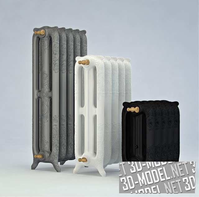 Стильные чугунные радиаторы в ретро-стиле Apollo от GuRaTec. Представлены радиаторы трех типоразмеров (по пять секций разной высоты) в четырех цветах (черный матовый, золотистый, серебристый, белый). Поверхности ребер радиаторов украшены литьем с барочными орнаментами. На входе и выходе радиатора смонтированы латунные краны в ретро-стиле.