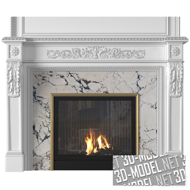 Выполненный в классическом стиле белый камин украшен лепниной и вставкой из белого мрамора. Камин создает реалистичную атмосферу комфорта и уюта. Кажется, слышно потрескивание дров и ощущается настоящее тепло.