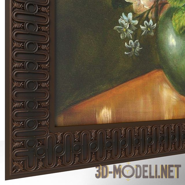 Квадратная картина в деревянном багете от компании «Грандекор». На холсте масляными красками изображён букет цветов в вазе. Стилистически картина выполнена в традициях старинных фламандских и голландских живописцев. В букете пионы, розы, гвоздики, тюльпаны. Ваза шарообразная, тёмно–зелёная. Багет коричневый с патиной, украшен мелким орнаментом. Картина подойдёт для размещения в классическом интерьере.