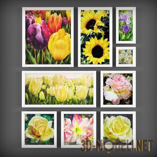 Коллекция интерьерной живописи от Lyn Diefenbach, в виде нескольких картин с изображениями цветов, скомпонованных в две группы: из трёх и девяти предметов. Нарциссы, ирисы, розы, тюльпаны, подсолнухи - яркие изображения цветов обрамлены простыми белыми рамками. Архив содержит 33 текстуры.