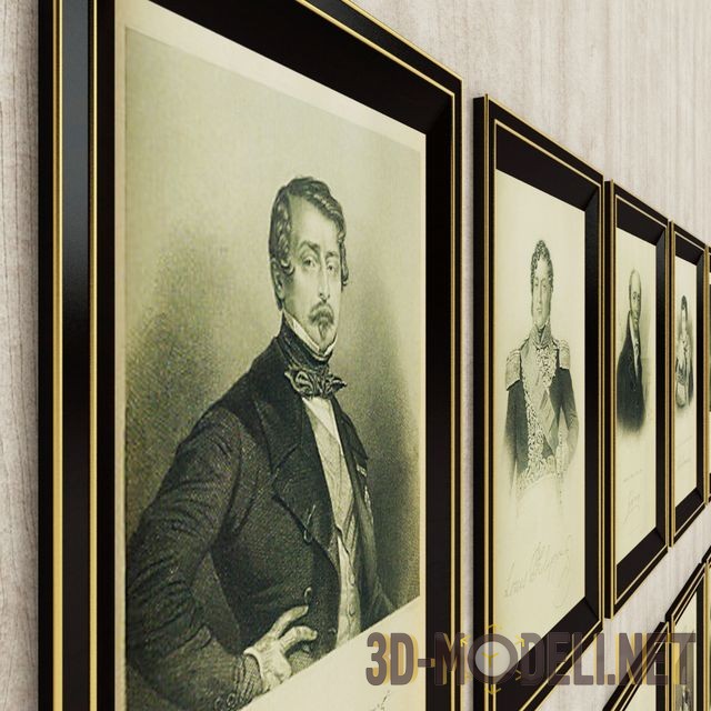 Пятнадцать портретов с чёрно–белыми гравюрами в коричневых рамках, от бренда Restoration Hardware. На портретах – известные европейские личности конца XVIII, начала XIX века. Портреты можно использовать для декорирования стены в библиотеке, кабинете или аудитории в классическом стиле.