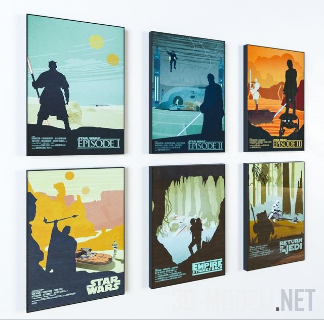 Композиция для украшения современного интерьера из шести постеров, посвященных фильмам из серии «Star Wars». Выполненные в одной технике принты упакованы под стекло в тонких черных рамках. Размеры: 110 x 80.