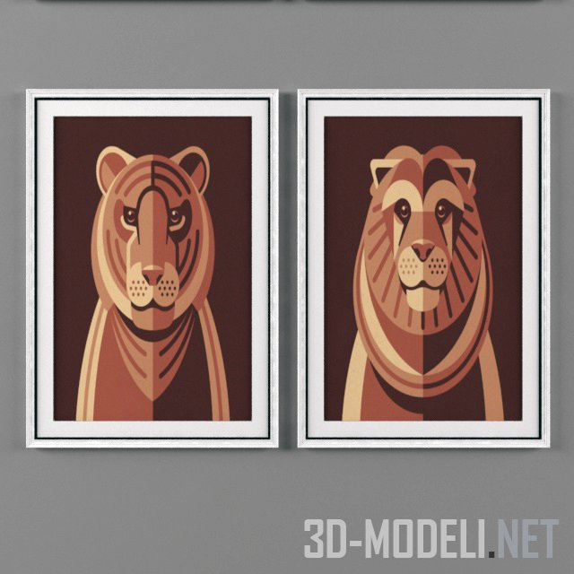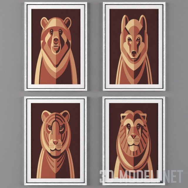 Четыре картины с животными, выполненными в оранжево-коричневой цветовой гамме в современном стиле.