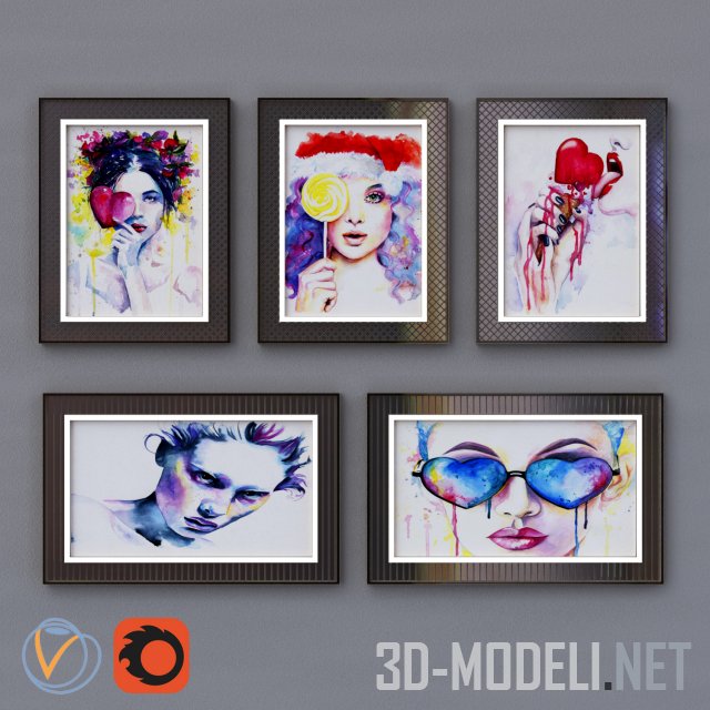 Пять стильных современных картин, выполненных в современной технике акварельными красками. Качественная модель, для придания стильного акцента в интерьере.
