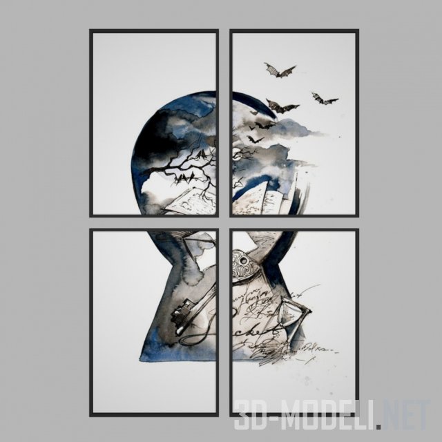 Выполненные в абстрактном стиле картины, состоят из четырех отдельных частей. На одной изображена виолончель, а на другой замочная скважина, через которую виден мир. Картины наполнены философским содержанием и идеально подходят для украшения современного пространства.