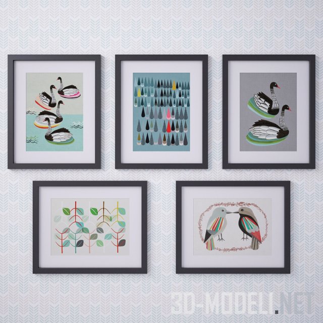 Много ярких цветных абстрактных картин в темных рамках. На картинах изображены цветы, фигурки птиц, животных, различные узоры. Такие картины хорошо подойдут для декора интерьера детских комнат и помещений, предназначенных для работы с детьми. Но и в интерьере с нотками скандинавского стиля картин также займут свое место.