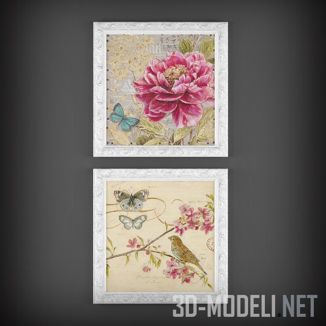 Милый сборник картин для интерьера в стиле прованс. На рисунках изображены птицы, цветы и бабочки. Присутствуют картины прямоугольной м квадратной формы.