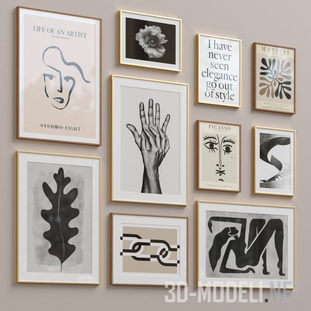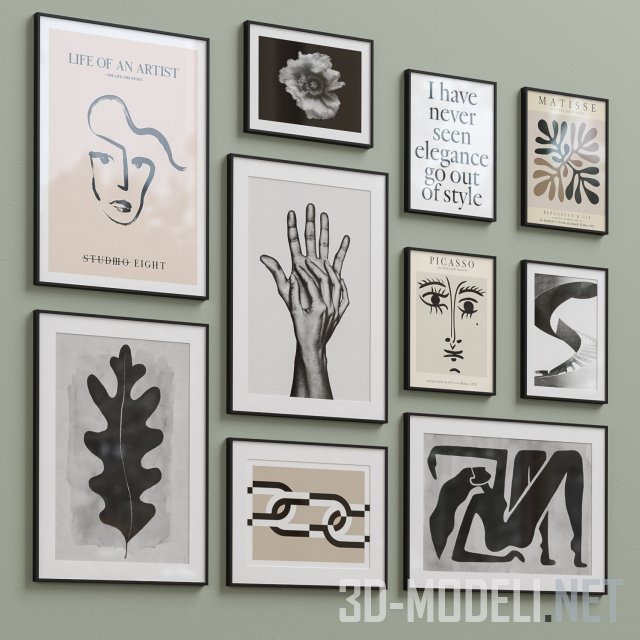 Наборы фотографий и графических работ в стиле модерн, оформленные в застекленные фоторамки нескольких размеров и из разных материалов. Представлены рамки следующих размеров (вертикальные и горизонтальные): 50х70см, 40х30см и 50х40см. Цвета: белые, черные, серебристые, золотистые и «под дерево».