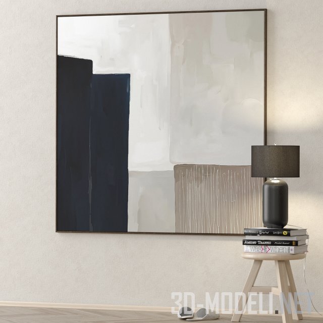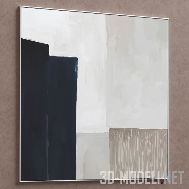 Холст с абстрактным изображением. Основной цвет картины бежевый и темно-синий, что смотрится очень гармонично. Холст вставлен в раму, предлагается пять различных материалов (белый, черный, серебро, дерево, золото). Каждый из них подходит к изображению. Размеры каркаса: 130 x 130 см.