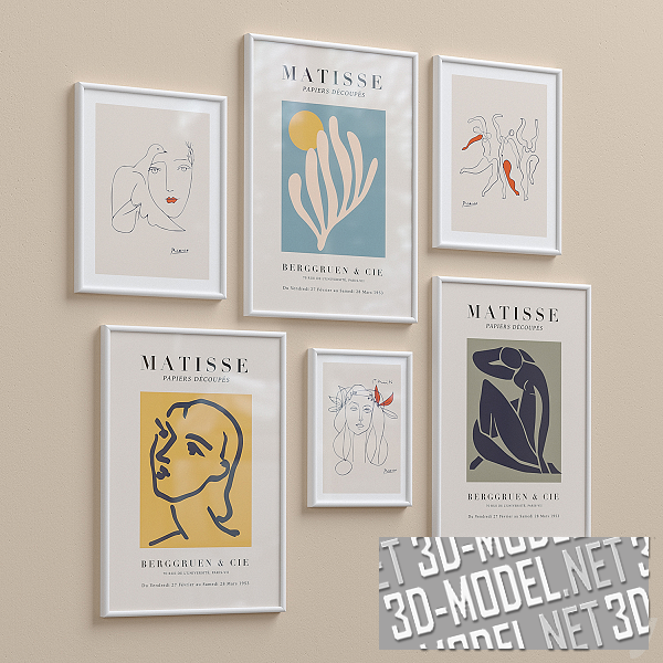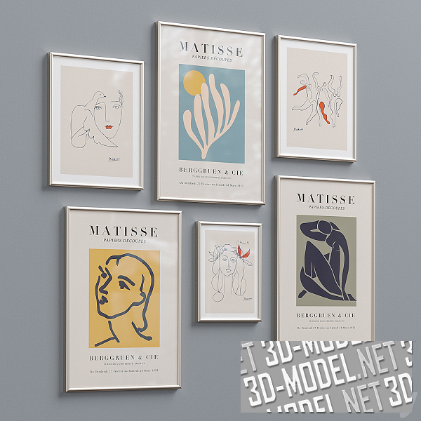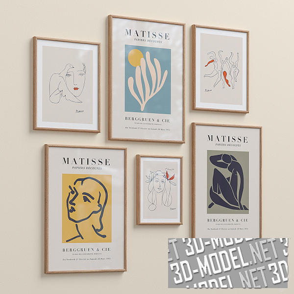 Украсить интерьер проще всего с помощью предметов изобразительного искусства. Этот набор из интерьерных абстрактных картин серии Matisse Line станет хорошим вариантом. Картины представлены в трех вариантах размера рам (50 x 70, 40 x 50, 30 x 40 см) и разных материалах и цветовых решениях. Основной цвет изображения бежевый, голубой и желтый.