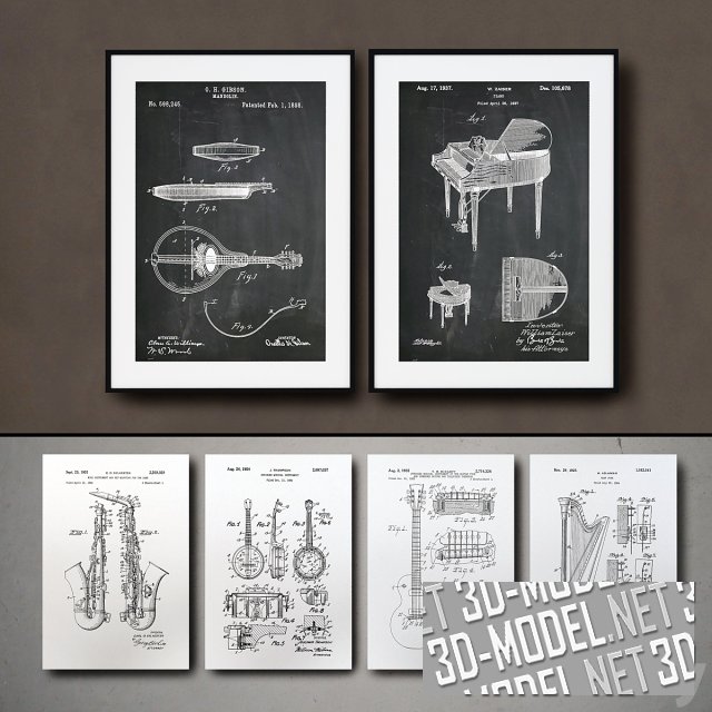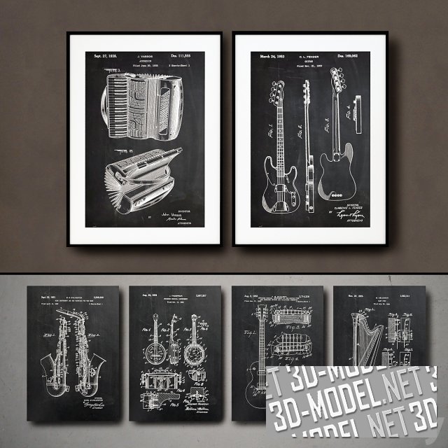 Коллекция декоративных настенных панно в фоторамках на тему «Музыкальные инструменты». Копии страниц энциклопедии музыкальных инструментов представлены в нескольких видах: в виде монохромных рисунков на фоне цвета старой бумаги; в виде черно-белых копий на светло-сером фоне и инвертированные ксерокопии (белый рисунок на черном фоне). Некоторые из панно обрамлены в черные тонкие рамки с белым паспарту. Постеры хорошо смотрятся и без рамок.