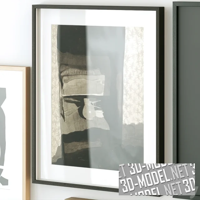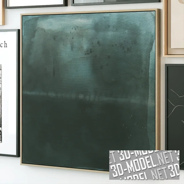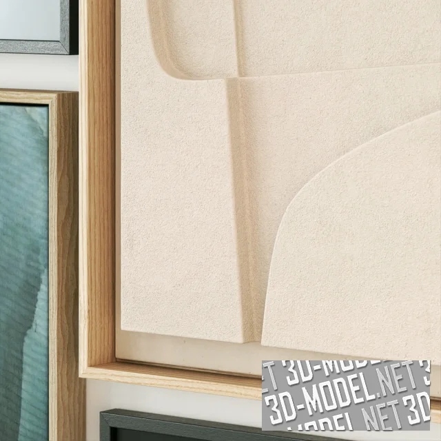 Декоративные интерьерные художественные работы в небольших деревянных рамках (черных и с текстурой светлого дерева). Габарит галереи: 137,5х192см. В наборе: абстрактные работы, живопись на холсте, постеры, графика, рельефное панно от Atelier Plateau.