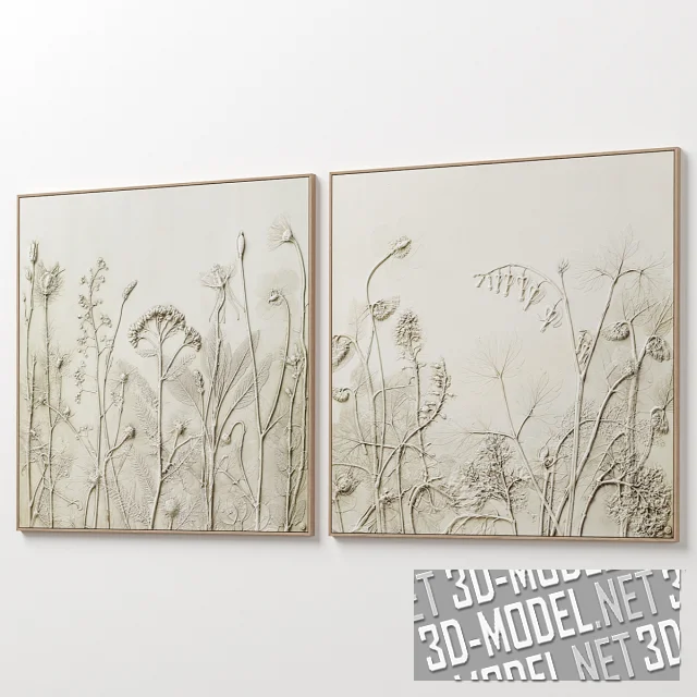 Набор из двух картин в современном стиле. На холстах в узких деревянных рамах (представлены в нескольких вариатах цвета) нанесена текстурная гипсовая штукатурка в светлых тонах. Гипсовые текстурные полевые цветы в стиле Бохо прекрасно впишутся в любой современный интерьер. Размер рамы: 110 x 110 см.