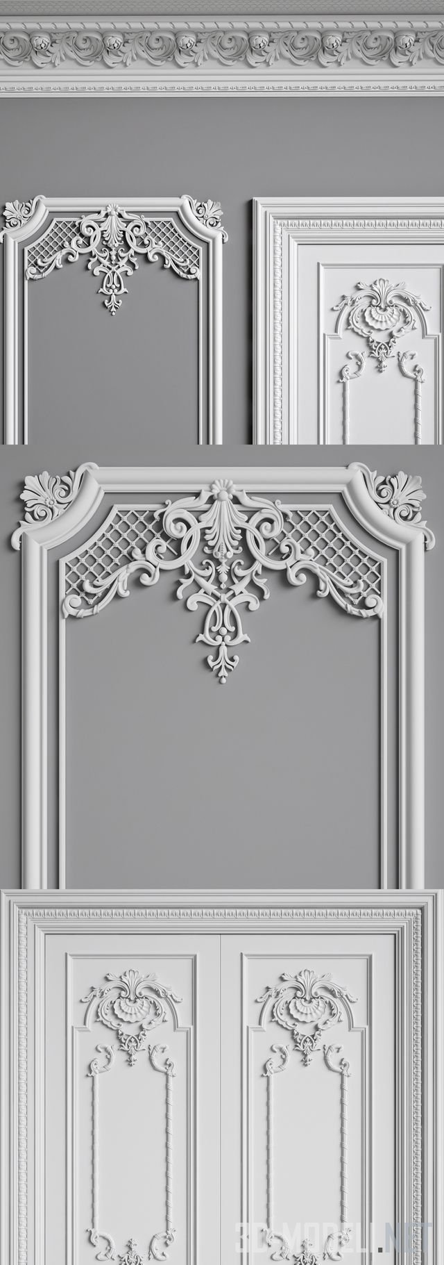 Элементы для классического интерьера. В комплекте входная двухстворчатая дверь, широкий фриз, стеновые панели и плинтус в барочном стиле. Весь декор белого цвета, с тонкой витиеватой лепниной и резьбой.