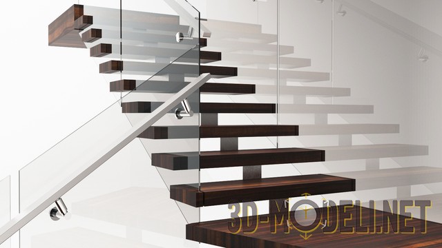 3d-модель современной деревянной лестницы. Конструкция с забежными ступенями и гладким стеклянным ограждением. Такая лестница отлично подойдет для любого современного интерьера.