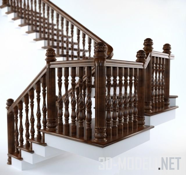 Классическая деревянная двухмаршевая лестница, с площадкой. Белого цвета подступенки идеально гармонируют с деревянными ступенями и балясинами перил. Лестница станет хорошим вариантом для частного особняка.