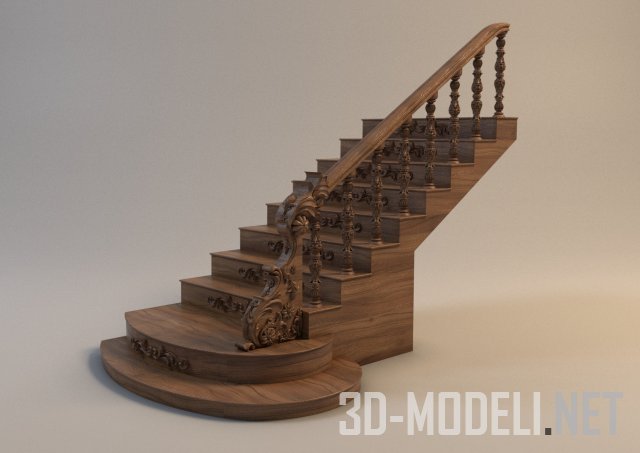 Красивая деревянная лестница в классическом стиле. Перила начинаются с подпорки, выполненной в барочном стиле и украшенной обильной резьбой. Резной инкрустацией украшены и подступенки лестницы. Закругленные ступени в нижней части делают лестницу красивой и эргономичной.