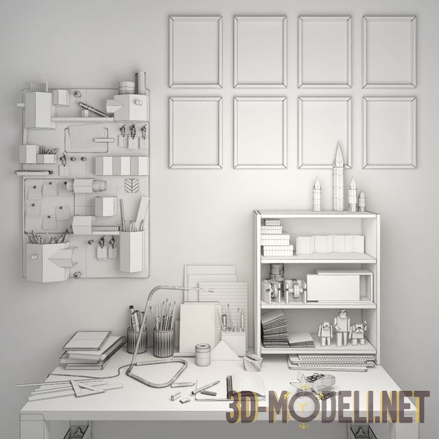 Набор всевозможных канцтоваров и аксессуаров, предназначенных для наполнения и декора рабоче-учебного пространства в современной детской комнате. Стильная настольная лампа, ежедневники, карандаши, ручки и линейки, декоративные элементы, статуэтки и картины, и многое другое. Набор позволит сделать интерьер более реалистичным и живым.