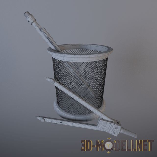 Небольшой офисный набор, включающий сетчатый стаканчик, циркуль и цанговый механический карандаш BIC. Стаканчик черный. Циркуль простой, пластиковый, со светло-серыми ножками и тёмно-синей верхушкой. На механическом карандаше светло-серый пластиковый корпус и серо-голубой зажим. В задней, торцевой части карандаша традиционно размещена стирающая резинка.