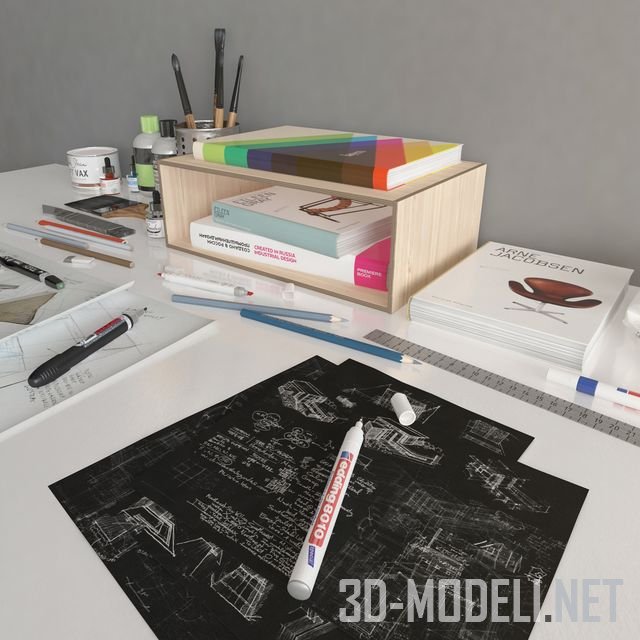 Набор для наполнения рабочего стола, в который входит множество предметов (резак, карандаш, бумага, кисти, краска, маркер), а также вешалки для чертежей.