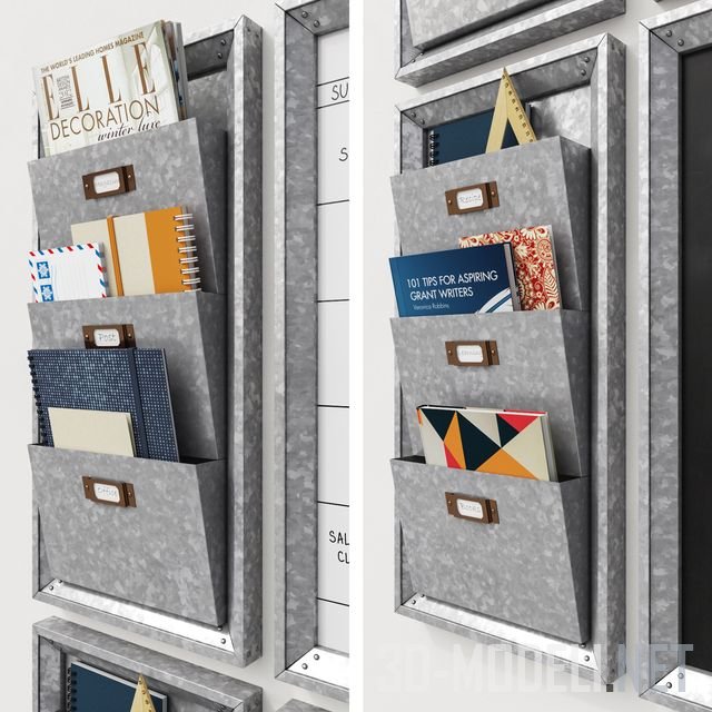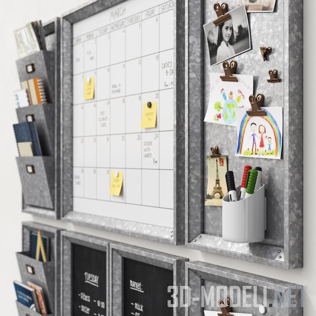 Магнитная доска, черная доска для мела, органайзер и календарь из гальванизированного, оцинкованного металла от Pottery Barn. Характерная пестрая, серебристая поверхность гальванизированного металла создает оригинальный декор в отделке рам панелей набора.