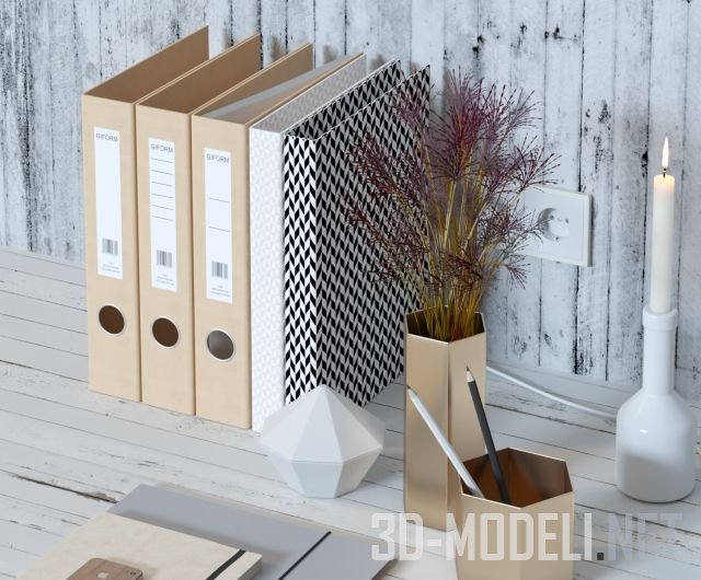 Декоративный сет для письменного стола. В комплекте два золотистых шестигранных стакана, в одном из которых находятся карандаши, в другом сухие цветы сиреневого цвета. Три толстых бежевых папки, одна белая и одна черно-белая, свеча в белом керамическом подсвечнике и настольная лампа Louis Poulsen AJ, дизайнер Arne Jacobsen органично дополняют набор.