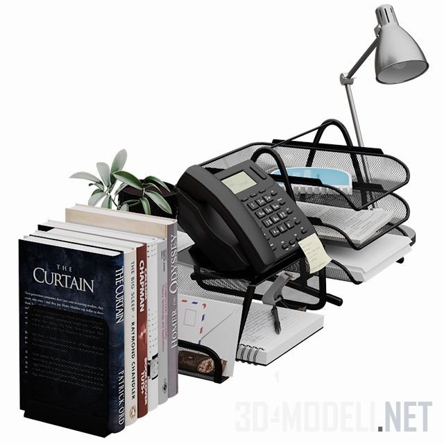 Декоративный набор для интерьера офиса. Сет содержит различные предметы для письменного стола: это настольная лампа, книги, сетчатые полки для бумаг, цветок и офисный стационарный телефон черного цвета.