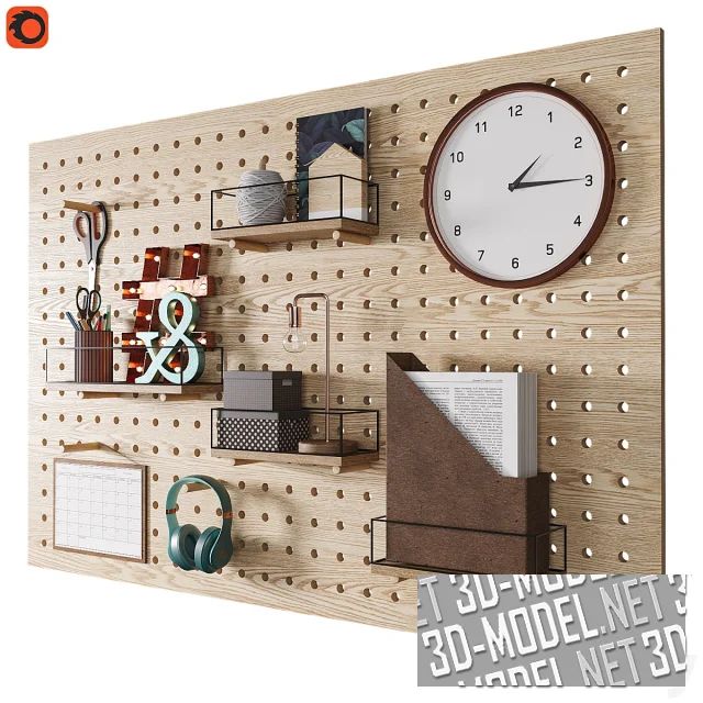 Современный настенный органайзер в виде деревянной доски с круглой перфорацией, с аксессуарами и декором. Для домашнего офиса или детской комнаты. В круглые отверстия перфорации вставляются деревянные штифты, служащие опорой для деревянных прямоугольных полок с черными металлическими проволочными ограждениями. На полках холдер с бумагами, коробки, настольный светильник со стойкой из гнутой медной трубки, стакан с карандашами, объемные символы с подсветкой и без, тетрадь, катушка со шнуром, фанерный сувенир в виде домика. Некоторые штифты служат крючками для навесных аксессуаров и предметов (мятные беспроводные наушники, ножницы, доска с таблицей, круглые настенные часы). Габарит доски: 150х100см.