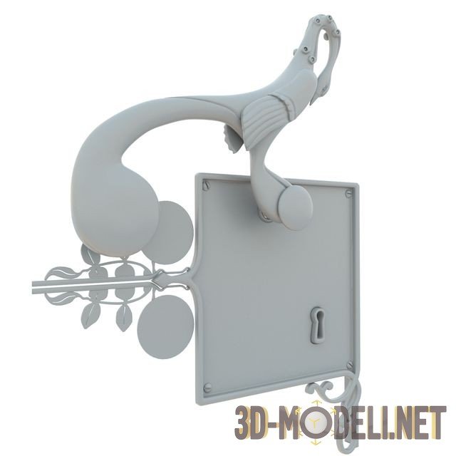 Декоративная накладка на замок двери, с ручкой в виде фигурки павлина. Большая квадратная накладка украшена гравировкой с растительным орнаментом. Барельефная рамка накладки выходит за пределы квадрата в виде элементов, продолжающих орнамент. Все детали изготовлены из желтого металла с чернением по углублениям изображения.