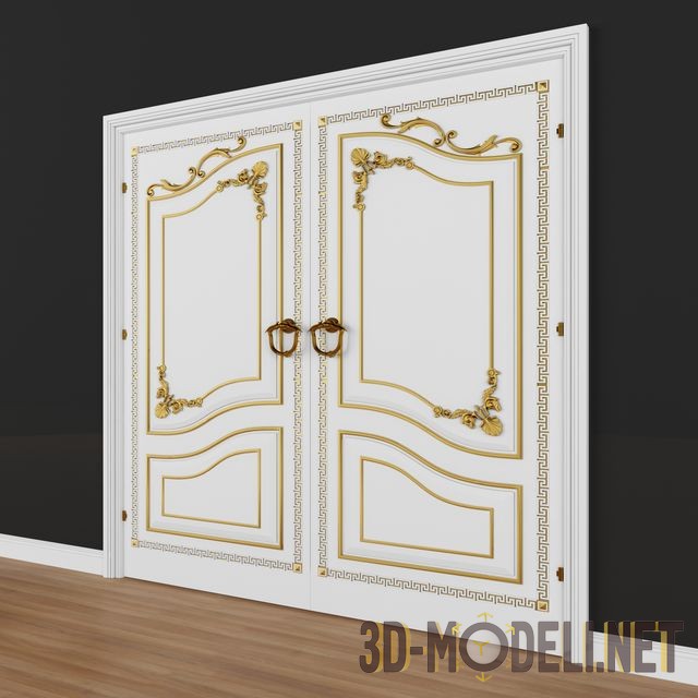 Большая двухстворчатая белая дверь с обильным золотистым декоративным узором в стиле барокко на створках. Пара бронзовых ручек–скоб смонтированы на полотнах дверей. Проём обрамлён белым профилированным багетом.