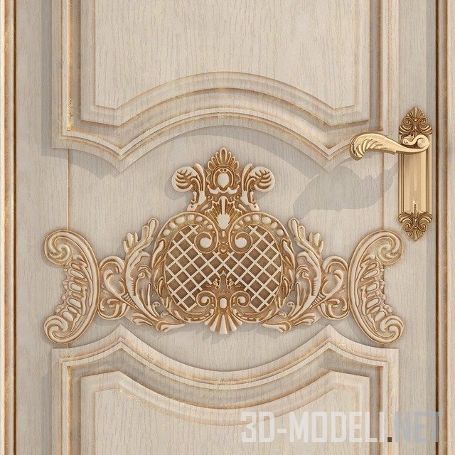 Роскошная классическая деревянная дверь из беленого дуба с золотистым патинированием. Полотно двери украшено фигурной филенкой и сложным резным элементом в стиле барокко. Дверная фурнитура представлена золотистой ручкой с завитками. Качественная модель с текстурами.