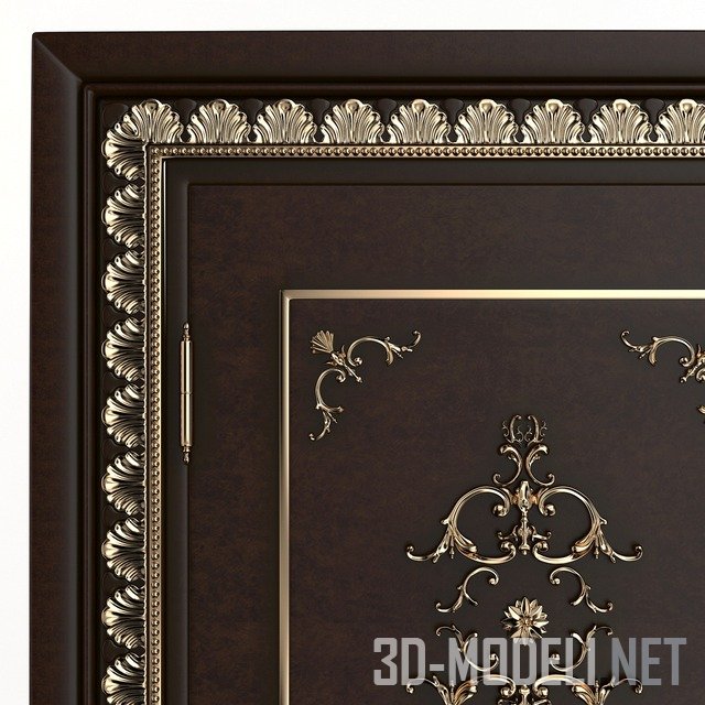 Темно–коричневая дверь с обильным золотистым декором и золотистой дверной ручкой в классическом стиле. По трем сторонам полотна двери размещен широкий наличник с барочным орнаментом в виде рокайля. Качественная модель со всеми текстурами.