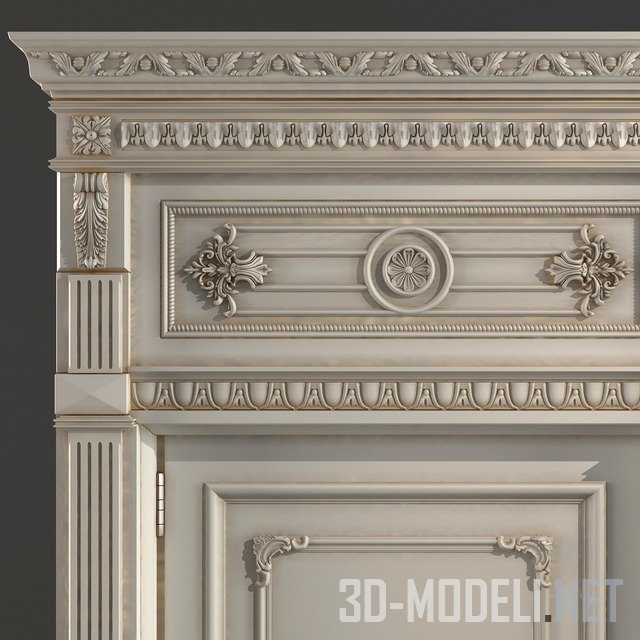 Дверь из массива дерева с большой декоративной панелью над полотном двери. Выполненная в стиле ампир, отделанная под слоновую кость (с молочно–белой поверхностью и бежевой патиной в углублениях резьбы), эта дверь украсит дом в классическом стиле с высокими потолками и большими площадями. Боковые наличники выполнены в виде пилястр с канелюрами и консолями в верхней части. Плоскость полотна двери декорирована молдингами с завитками в углах и резной овальной накладкой. Верхняя панель с резной цветочной розеткой увенчана широким багетом с гирляндой. Дверная ручка соответствует стилю двери – серебристая, с завитками и темным патинированием.