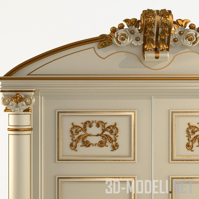 Двухстворчатая деревянная дверь art.92 в стиле барокко, цвета слоновой кости с резным декором – «античное золото». Роскошный портал обрамляют две гладкие полуколонны. Венчает проем полукруглый венец с резными цветами и консолями. Полотна двери украшают накладные резные фестоны и молдинги. Текстуры в архиве.