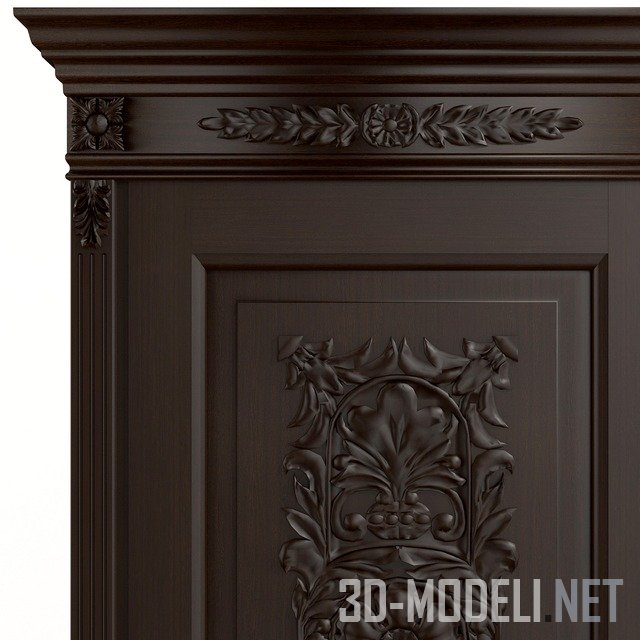 Дверь из массива дерева, тонированная в темно–коричневый цвет, и декорированная растительным резным орнаментом. Обрамляют проем пилястры с канелюрами и венец с цветочным орнаментом и багетом. Полотно двери украшает пара резных розеток с цветочным мотивом. Золотистая дверная ручка отлично сочетается с темно–коричневой отделкой двери.