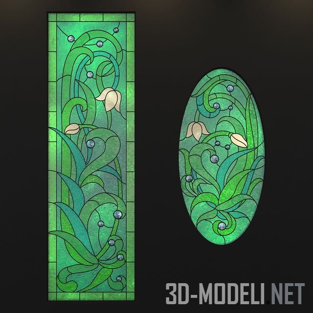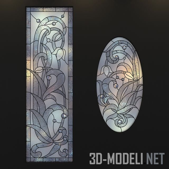 Пара витражей с цветочным изображением в стиле ар-нуво. Элементы скомпанованы в вертикальный прямоугольник и овал. Представлены три цветовых варианта. Качественная и реалистичная трехмерная модель с текстурами.