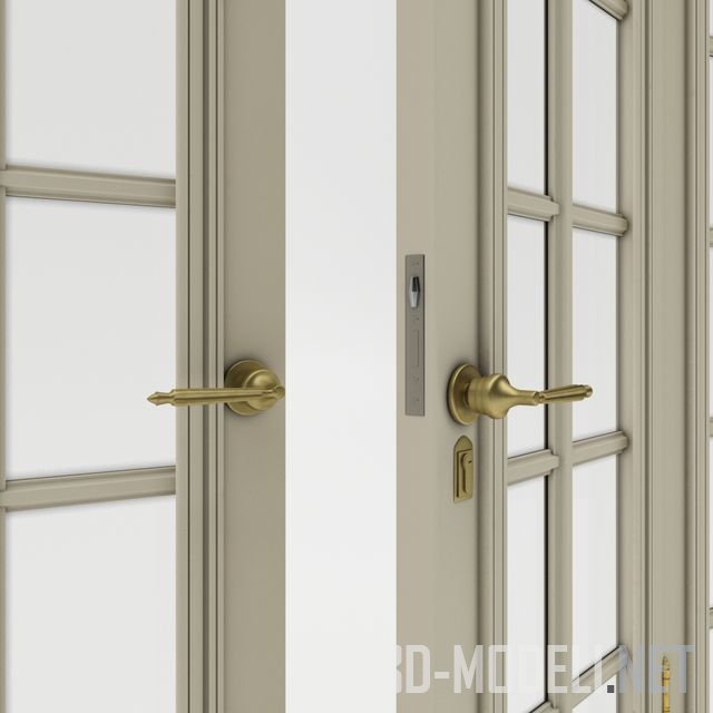 Деревянный дверной блок в классическом стиле в широкий проем. Две створки, добавочные плоскости и обрамление в виде пилястров и венца отделаны белым сатиновым лаком с патинированием во впадинах рельефов. Стеклопакеты в дверных полотнах и расширительных плоскостях выполнены в виде узких, вертикальных арок с переплетами. Фурнитура - в классическом стиле, цвета античной бронзы.
